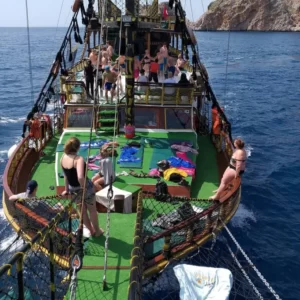 In our three-story pirate ship, you have the opportunity to enjoy the pleasant sound of the sea, sunbathe or dive into the turquoise waters of the Mediterranean. Adrenaline lovers can jump into its waves directly from the deck of our ship. With a little luck, we see wild dolphins or Caretta-Caretta turtles. And all this in the picturesque scenery of Alanya.